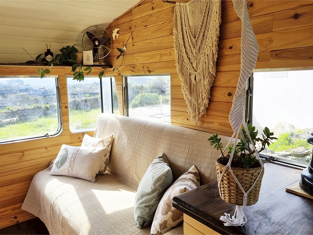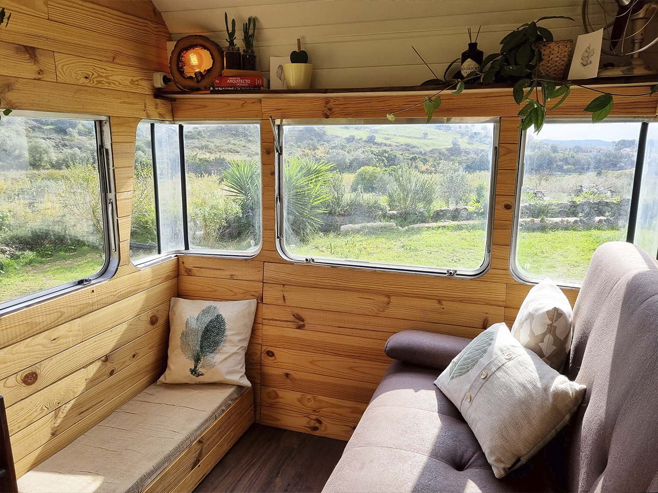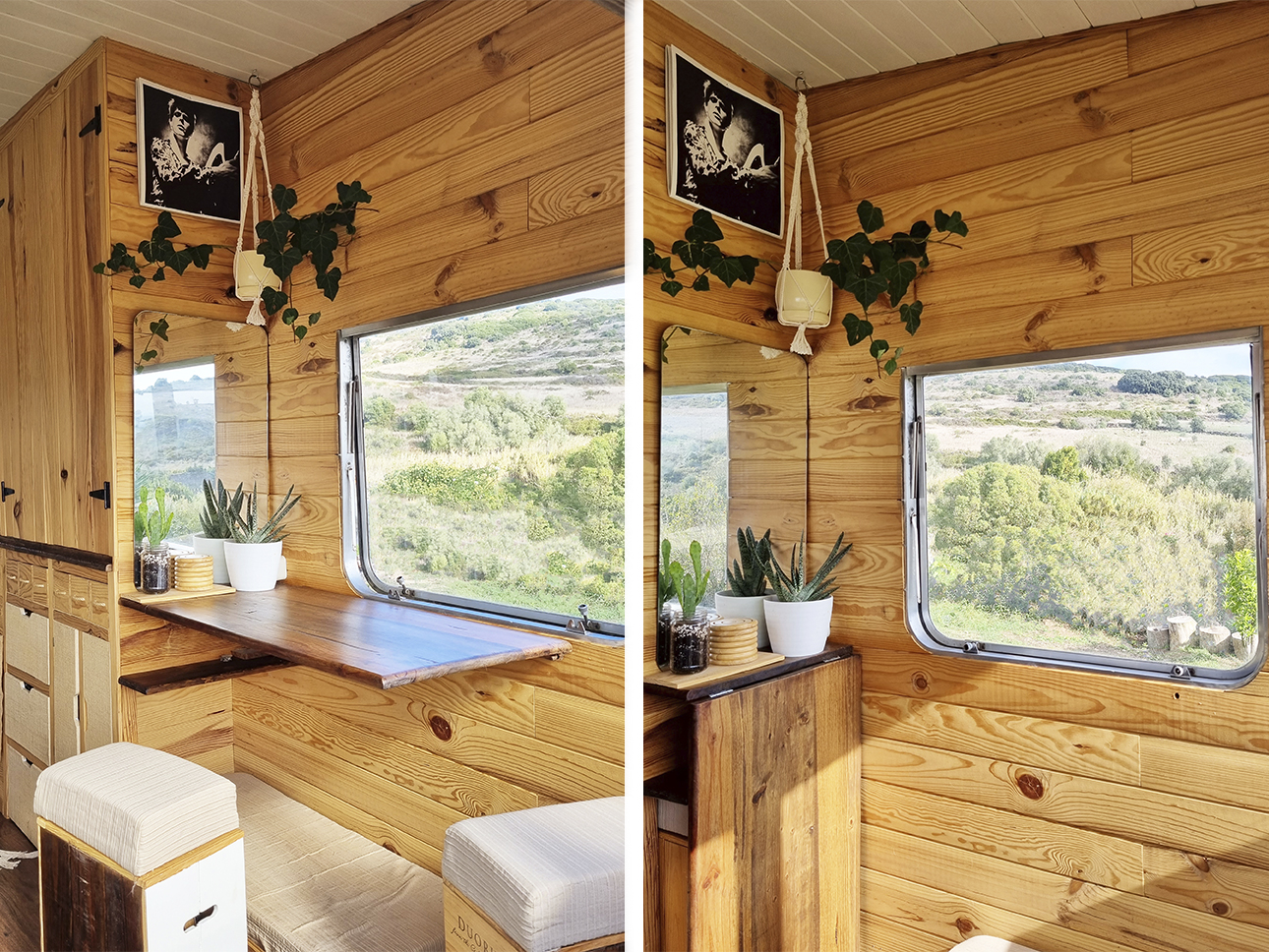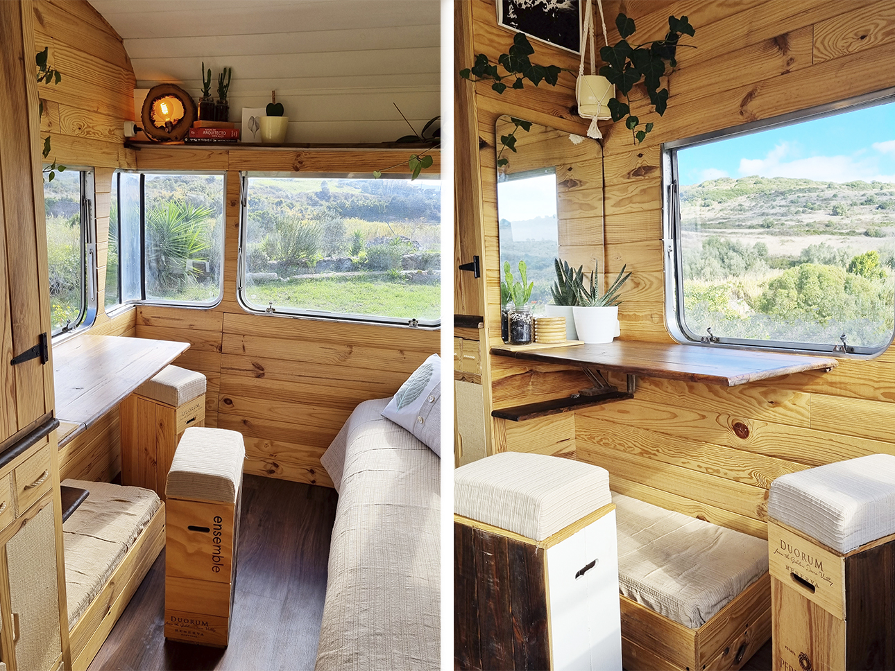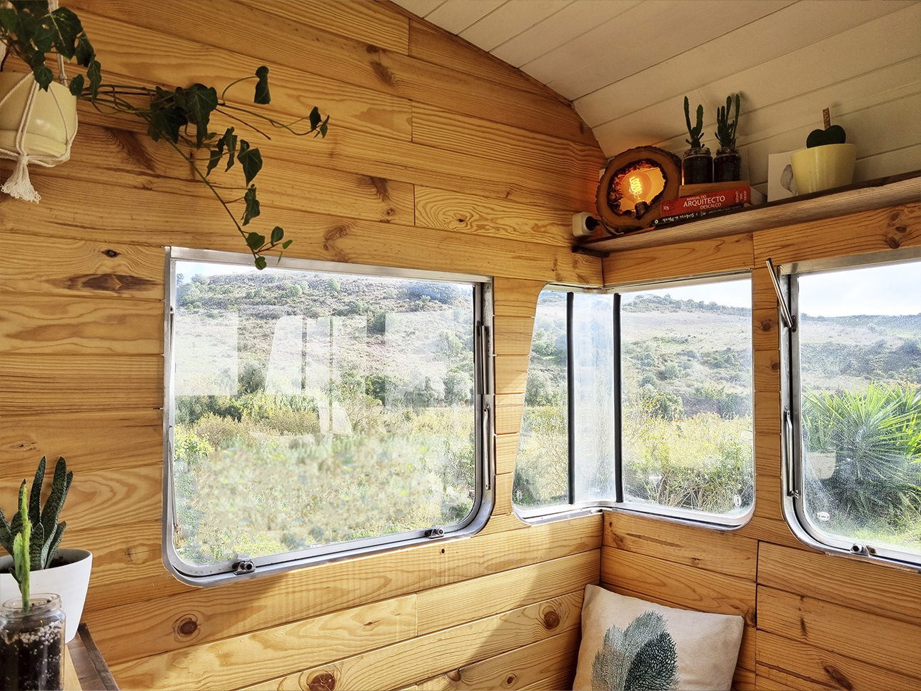 Esta Caravana Digue Amorette de 1970 com grande potencial estava mesmo muito degradada, mas o seu design vintage com grande janelas, fez-nos investir neste projecto. Um desafio, incluir no design de uma área tão pequena e específica todos os espaços de trabalho para a confecção dos produtos da associação Seiva Atelier e, ainda, a possibilidade de habitação, num ambiente confortável e de estética natural e singular Os diferentes espaços interiores, com boa arrumação, optimização de bancadas e cozinha com o indispensável, permitem a manufactura de pequenas peças de ecodesign (em macramé, madeira e cerâmica), a confecção dos produtos da drogaria natural e também espaço para escritório. No exterior, uma boa bancada de carpintaria para as peças de ecodesign, um pequeno deck para a prática de Yoga e um escritório a céu aberto, que pode também ser local de pausa e de contemplação da natureza.