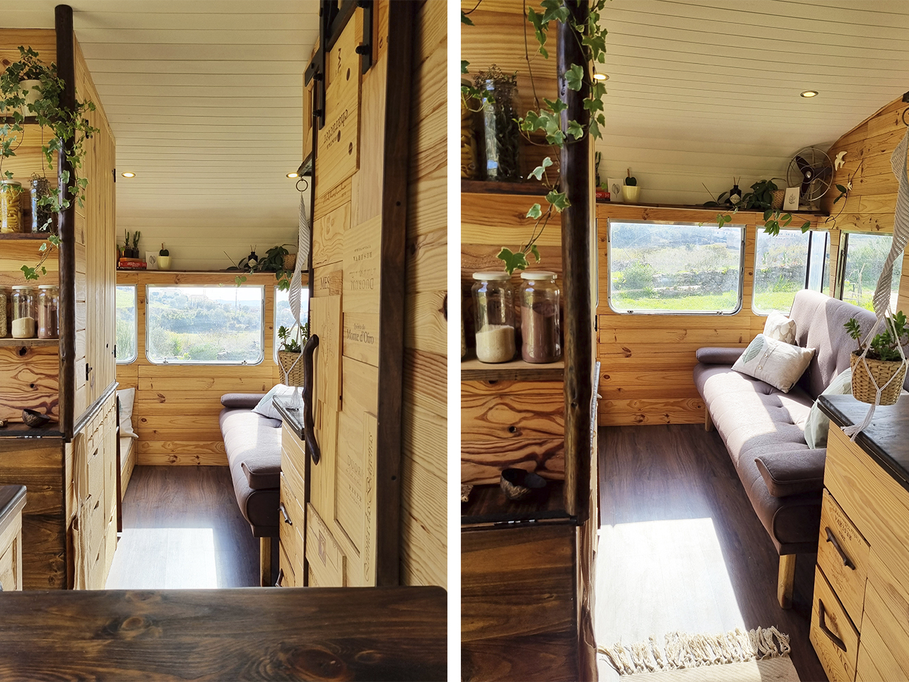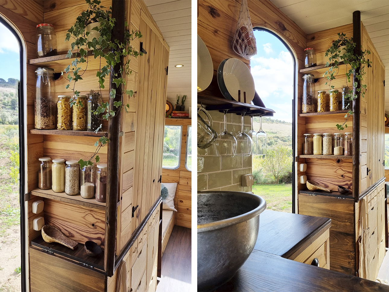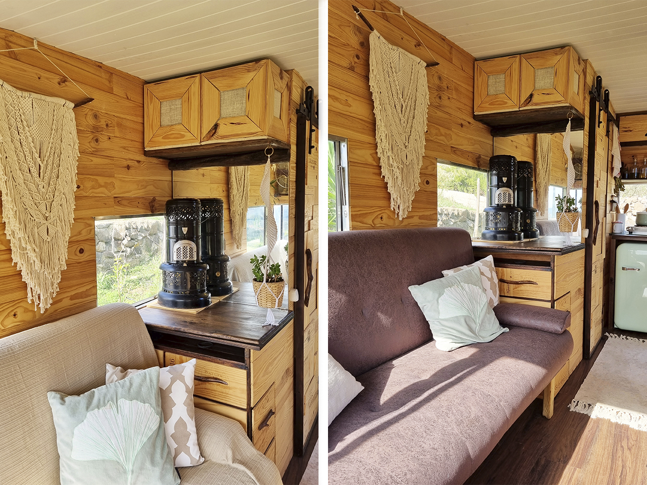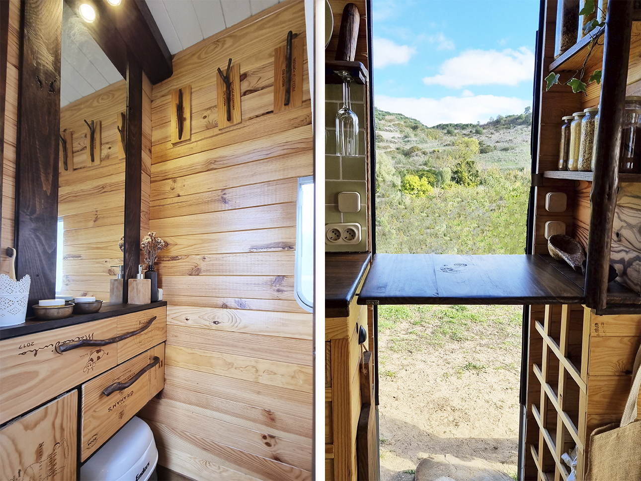 Esta Caravana Digue Amorette de 1970 com grande potencial estava mesmo muito degradada, mas o seu design vintage com grande janelas, fez-nos investir neste projecto. Um desafio, incluir no design de uma área tão pequena e específica todos os espaços de trabalho para a confecção dos produtos da associação Seiva Atelier e, ainda, a possibilidade de habitação, num ambiente confortável e de estética natural e singular Os diferentes espaços interiores, com boa arrumação, optimização de bancadas e cozinha com o indispensável, permitem a manufactura de pequenas peças de ecodesign (em macramé, madeira e cerâmica), a confecção dos produtos da drogaria natural e também espaço para escritório. No exterior, uma boa bancada de carpintaria para as peças de ecodesign, um pequeno deck para a prática de Yoga e um escritório a céu aberto, que pode também ser local de pausa e de contemplação da natureza.