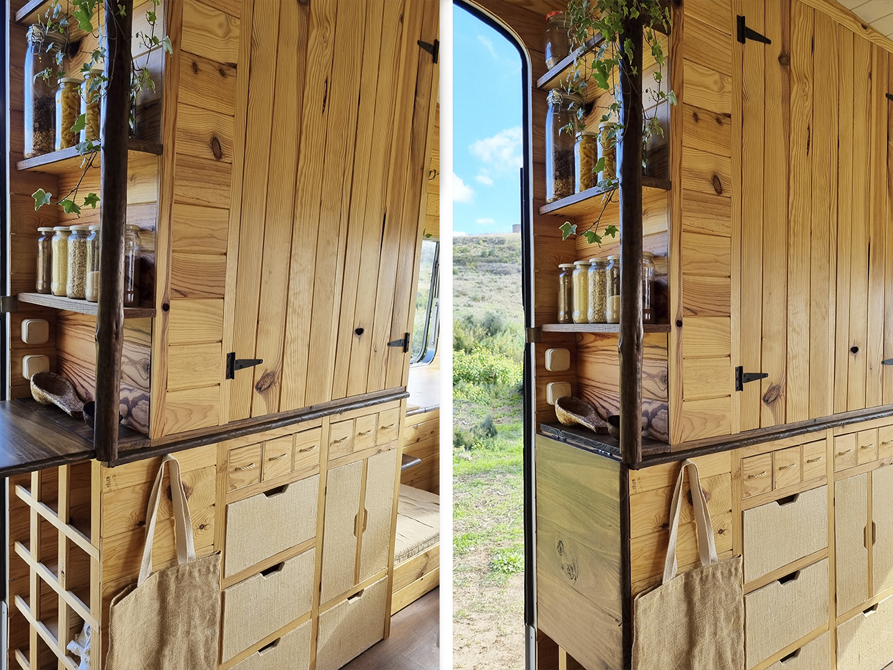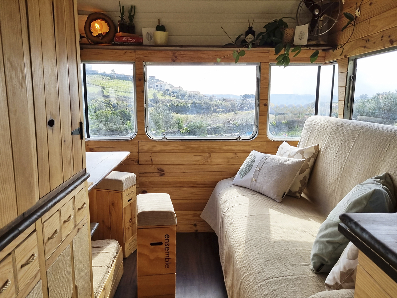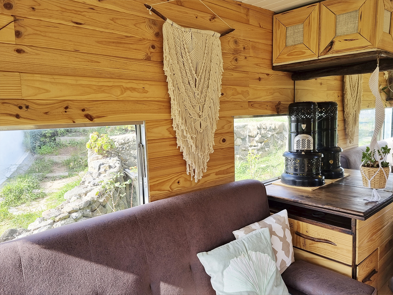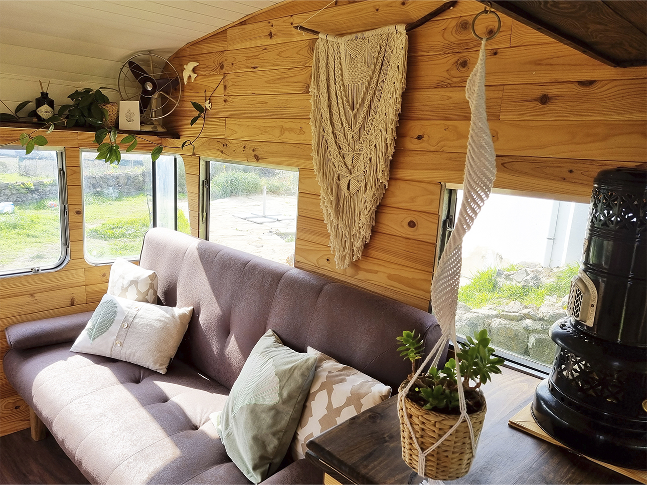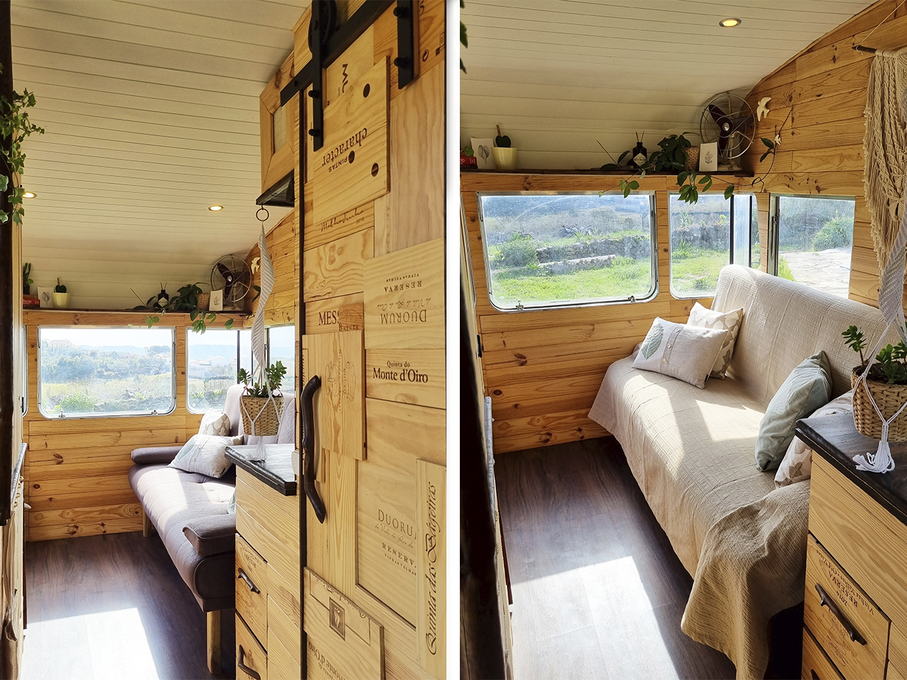 Esta Caravana Digue Amorette de 1970 com grande potencial estava mesmo muito degradada, mas o seu design vintage com grande janelas, fez-nos investir neste projecto. Um desafio, incluir no design de uma área tão pequena e específica todos os espaços de trabalho para a confecção dos produtos da associação Seiva Atelier e, ainda, a possibilidade de habitação, num ambiente confortável e de estética natural e singular Os diferentes espaços interiores, com boa arrumação, optimização de bancadas e cozinha com o indispensável, permitem a manufactura de pequenas peças de ecodesign (em macramé, madeira e cerâmica), a confecção dos produtos da drogaria natural e também espaço para escritório. No exterior, uma boa bancada de carpintaria para as peças de ecodesign, um pequeno deck para a prática de Yoga e um escritório a céu aberto, que pode também ser local de pausa e de contemplação da natureza.