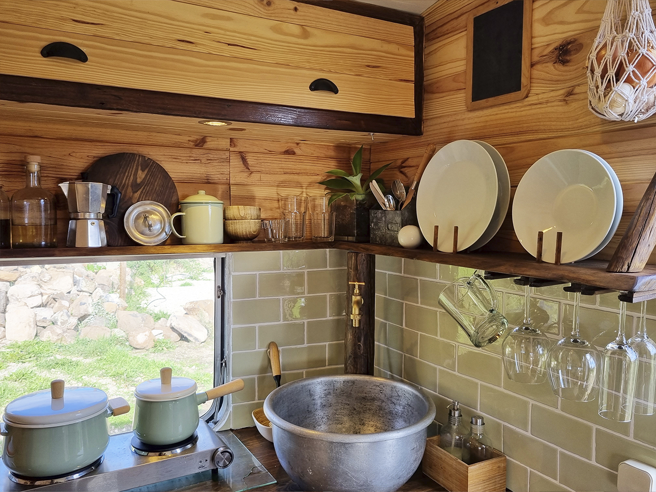 This Digue Amorette Caravan from 1970 with great potential was really run down, but its vintage design with large windows made us invest in this project. It was a challenge to manage include in the design of such a small and specific area all the workspaces for the production of Seiva Atelier's products and, also, the possibility of housing, in a comfortable environment and with a natural and unique aesthetic. The different interior spaces, with good storage, optimization of countertops and kitchen with only the essential, allow the manufacture of small ecodesign pieces (in macramé, wood and ceramic), the manufacture of natural drugstore products and also space for an office. Outside, a good woodworking bench for ecodesign pieces, a small deck for practicing Yoga and an open-air office, which can also be a place to pause and contemplate nature.